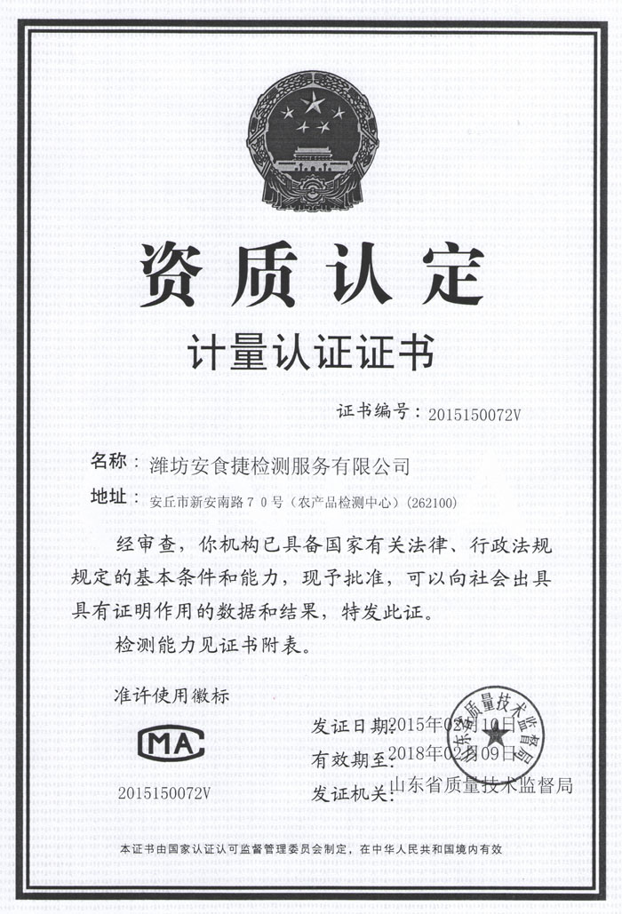 • 公司組建的第三方檢測中心——濰坊安食捷檢測服務(wù)有限公司獲省質(zhì)